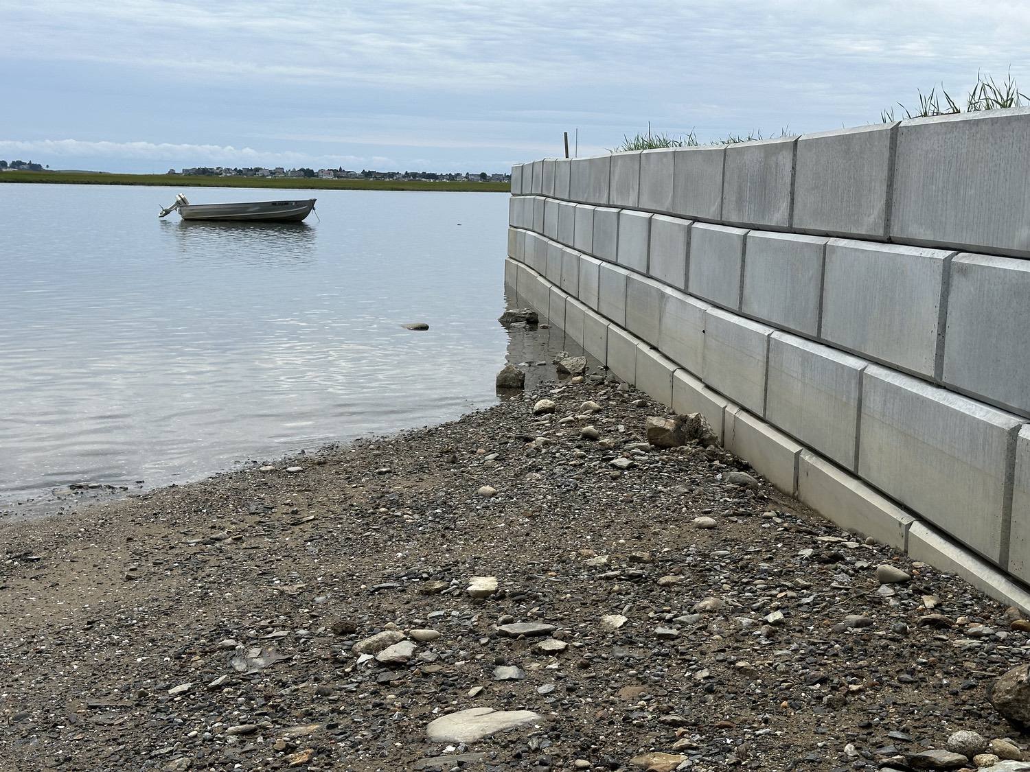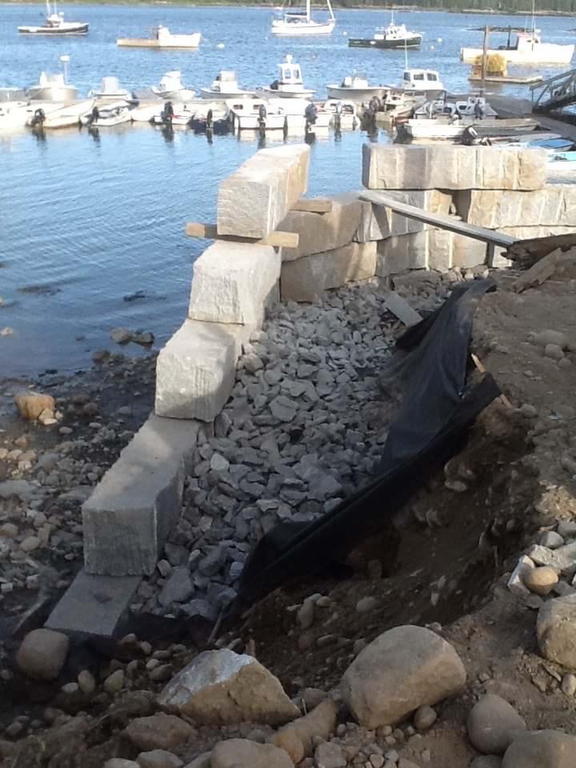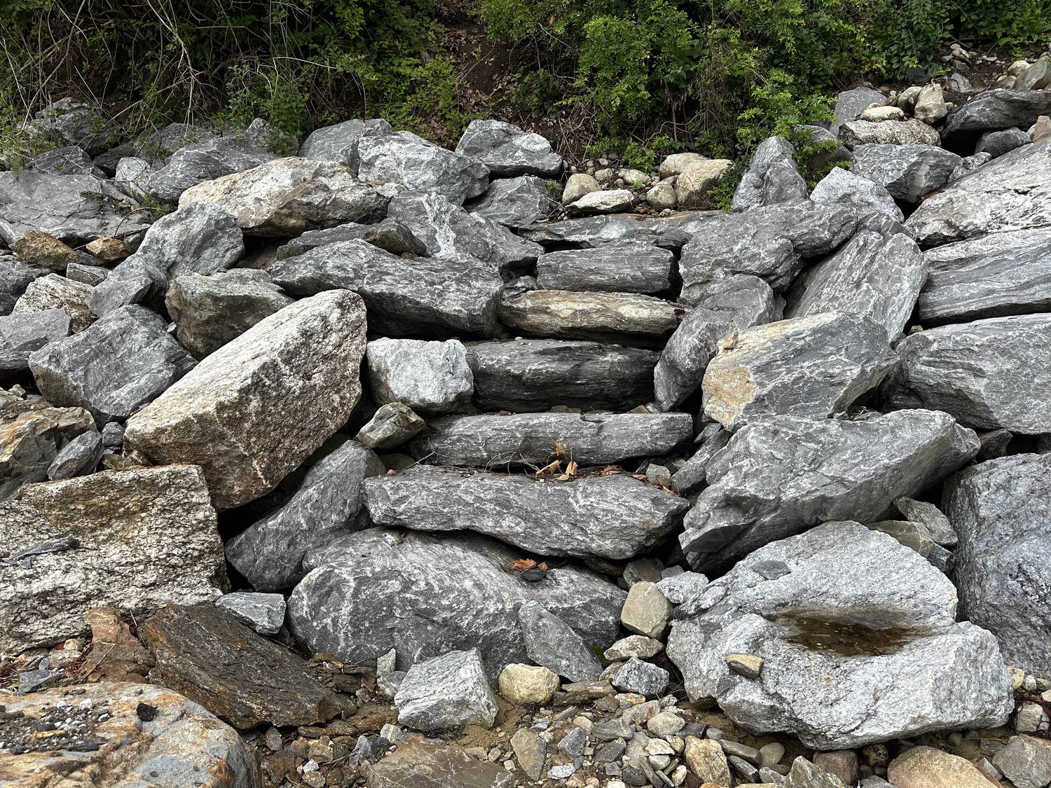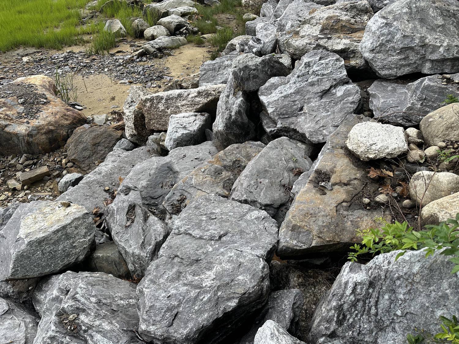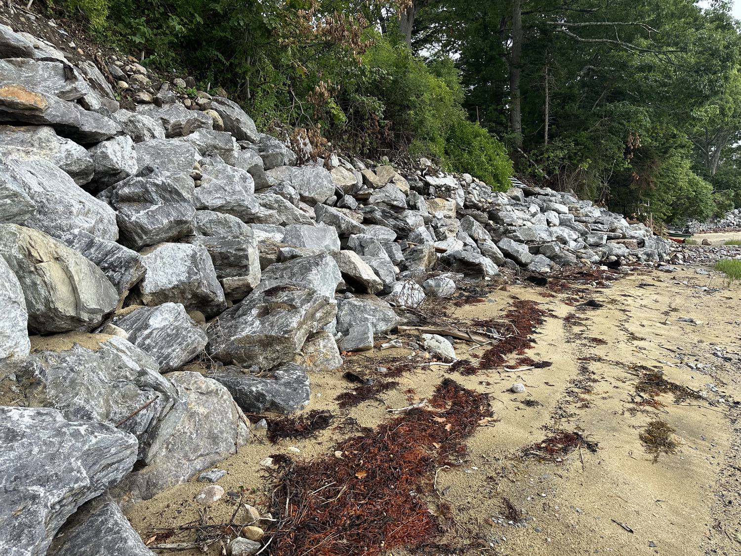 Blasted quarry stones create a jagged structure that dissipates wave energy