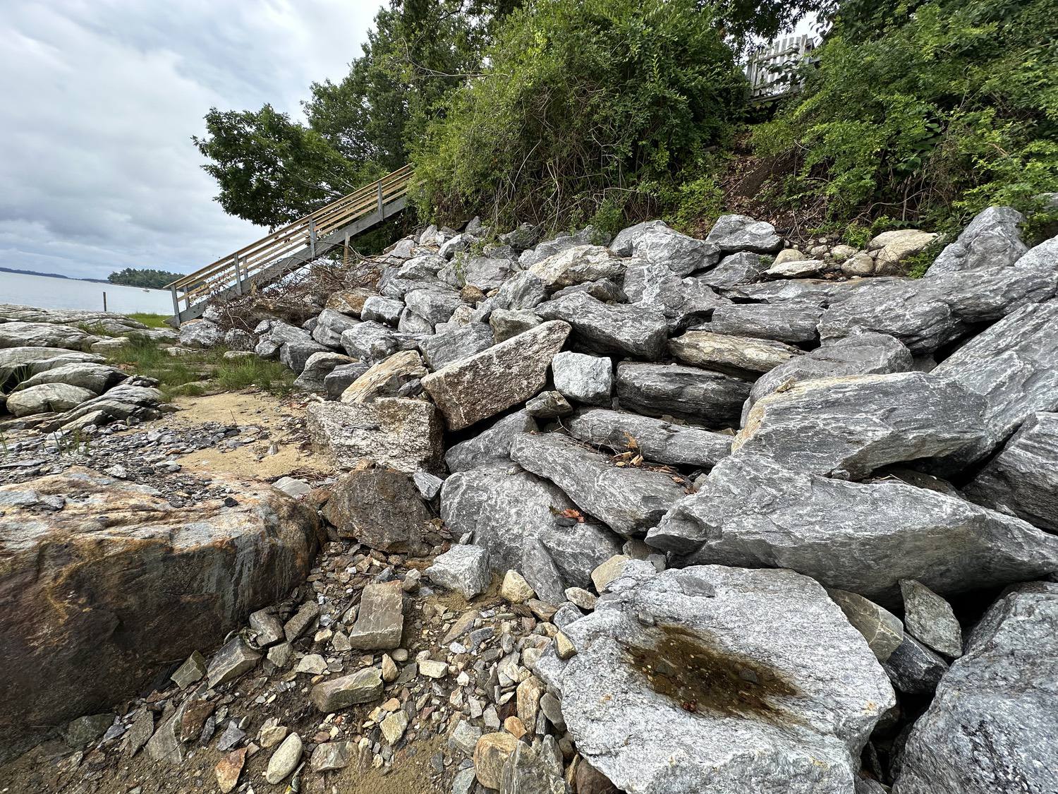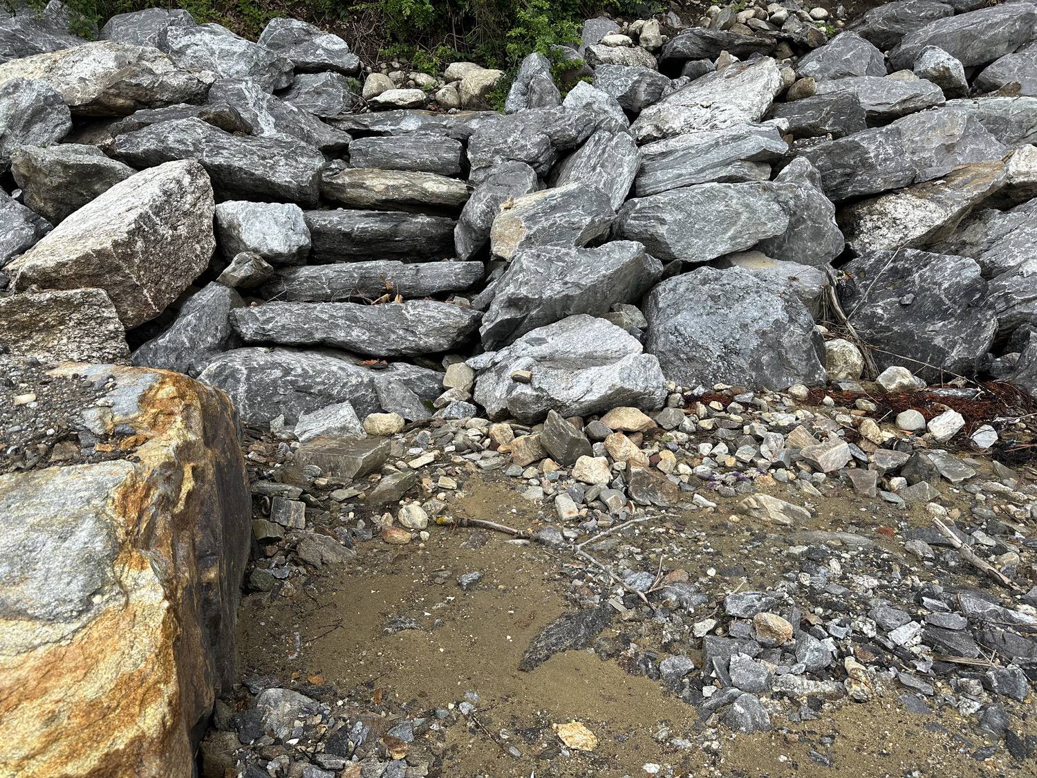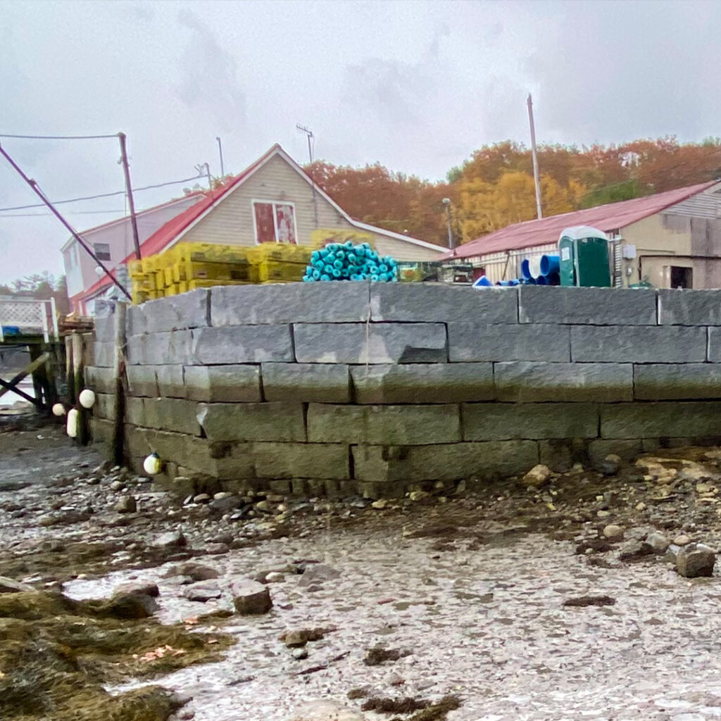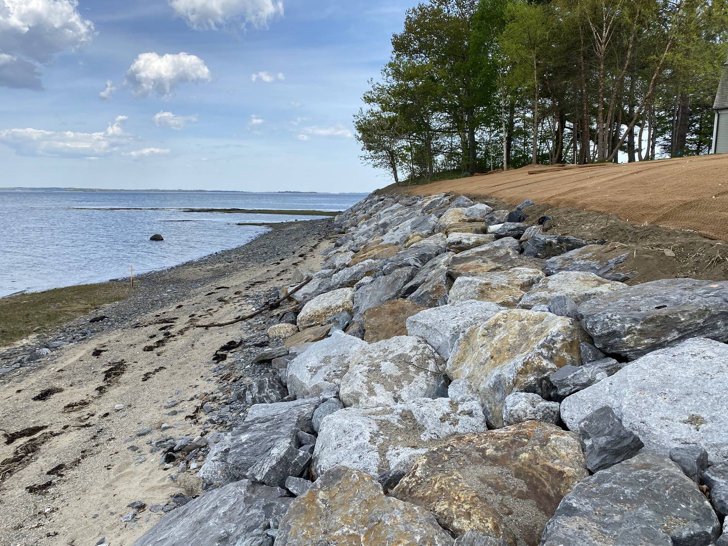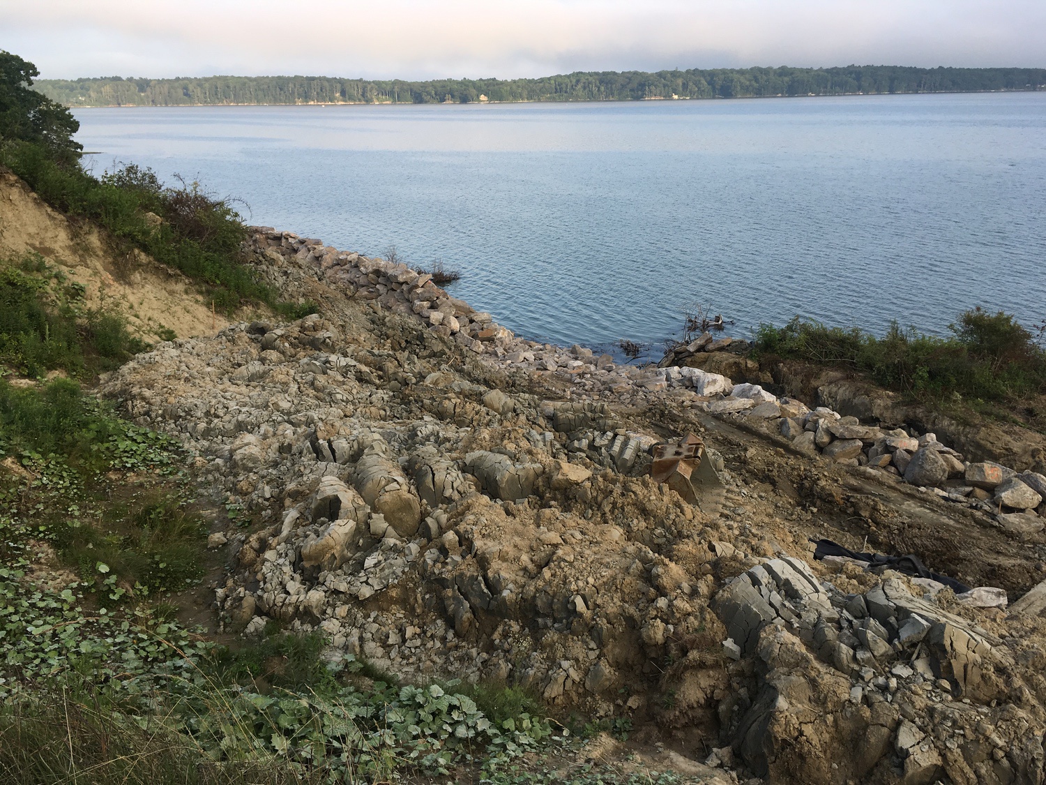 Blasted quarry stones create a jagged structure that dissipates wave energy