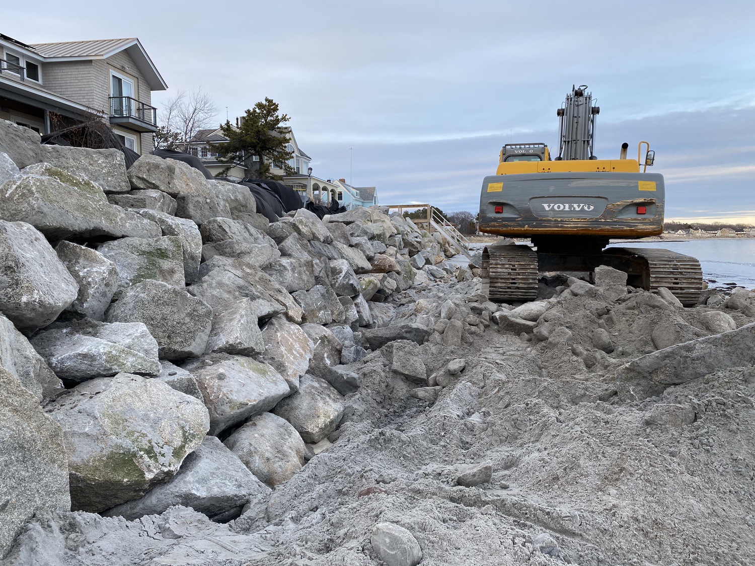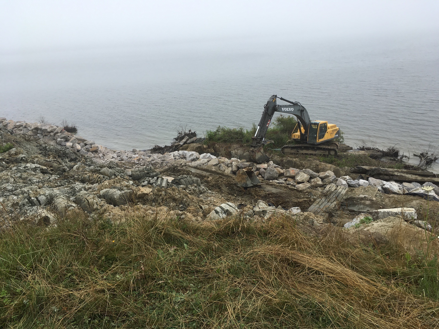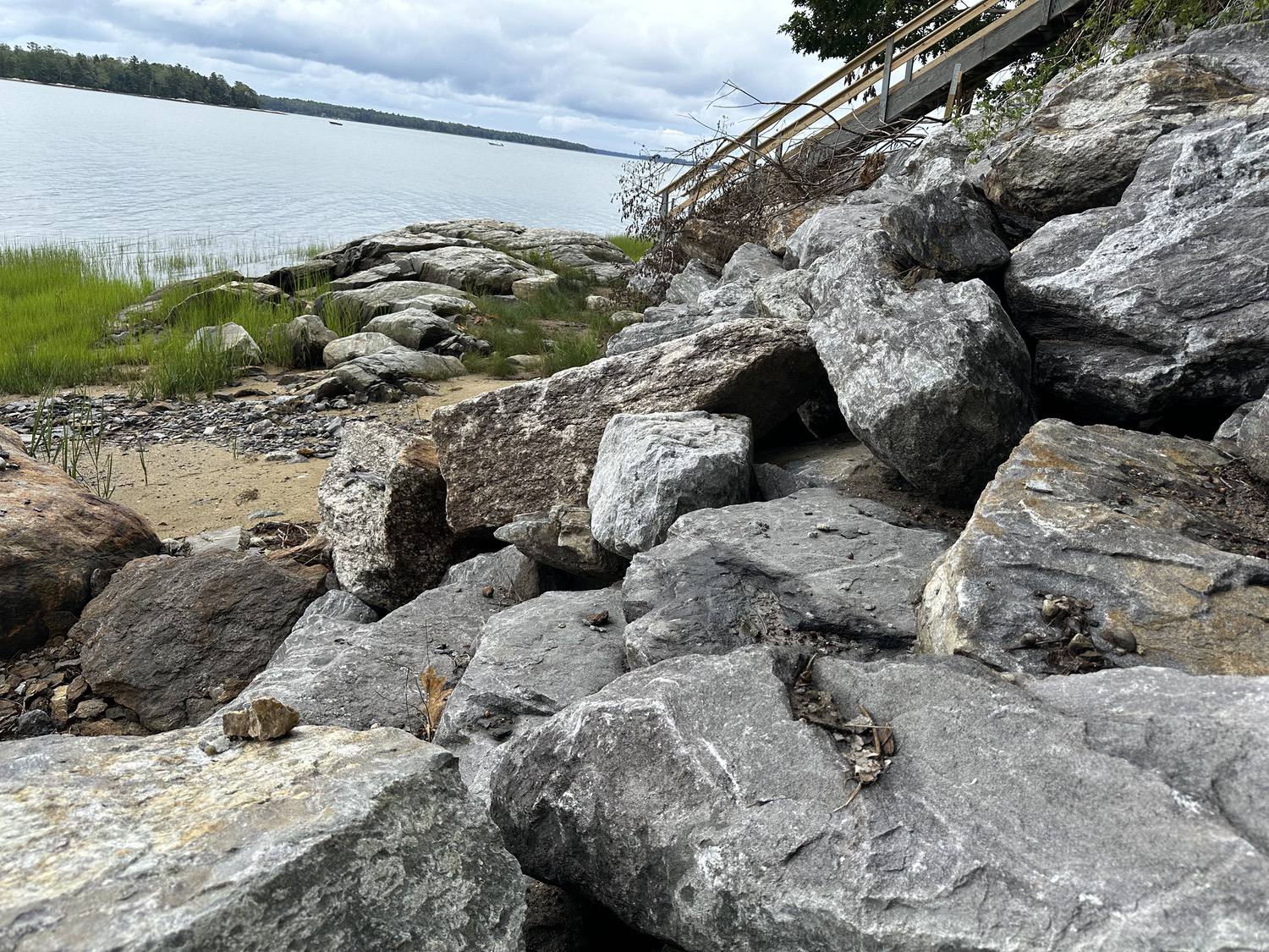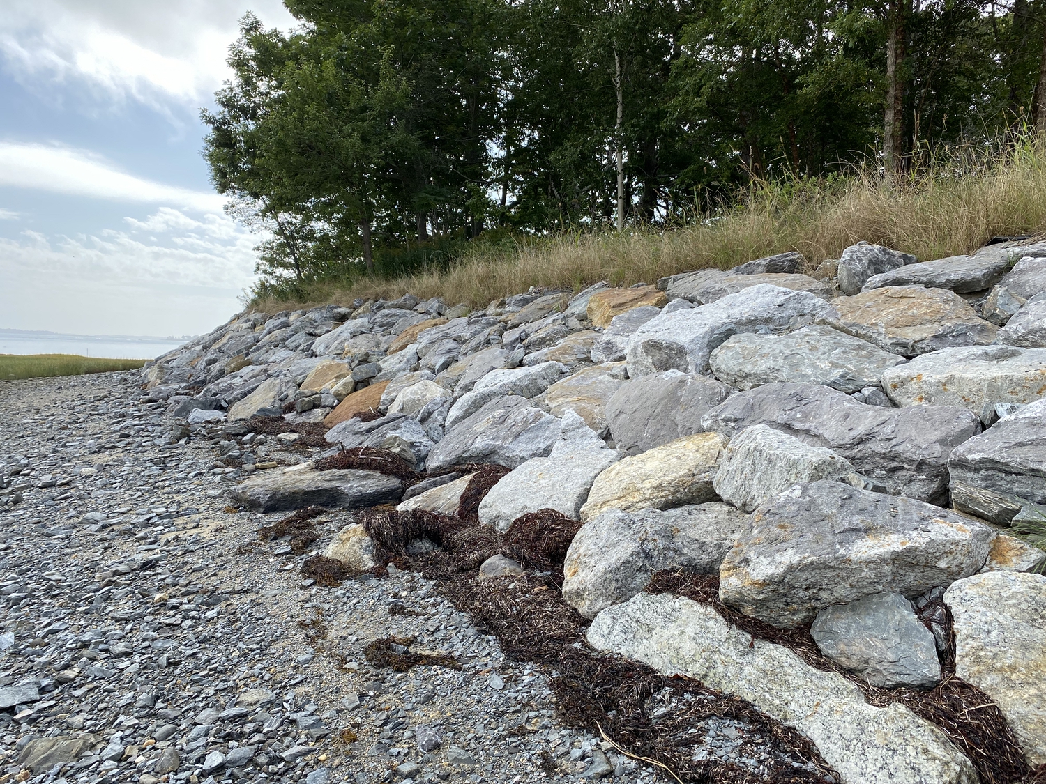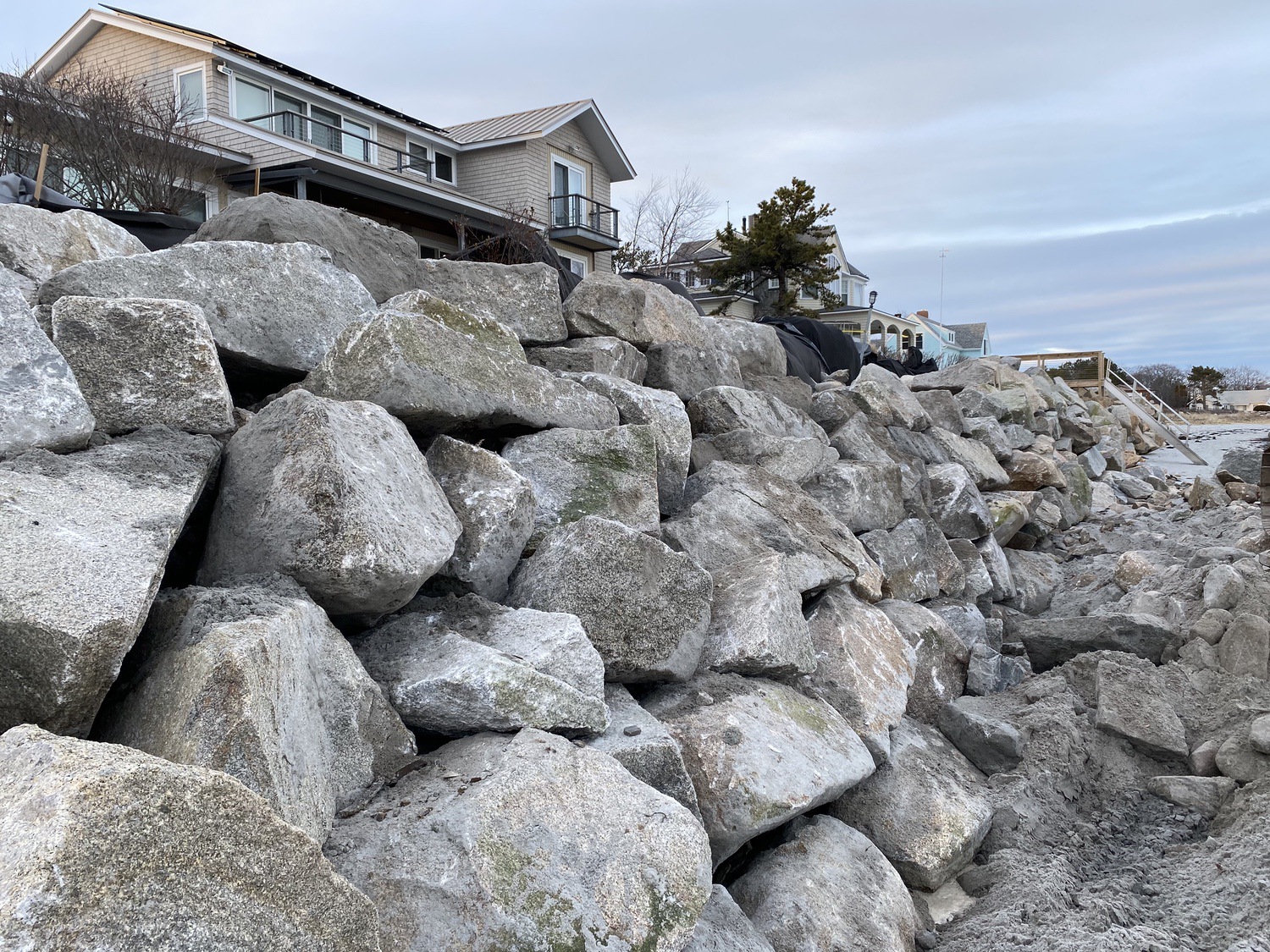 Blasted quarry stones create a jagged structure that dissipates wave energy