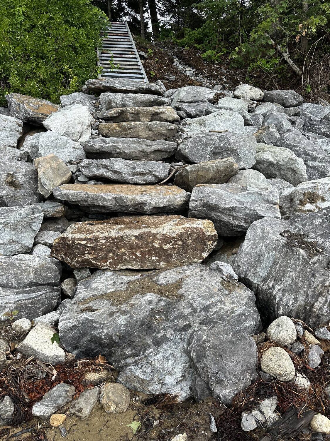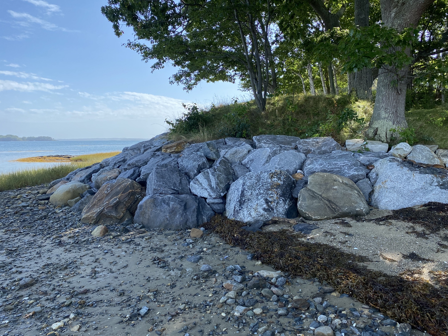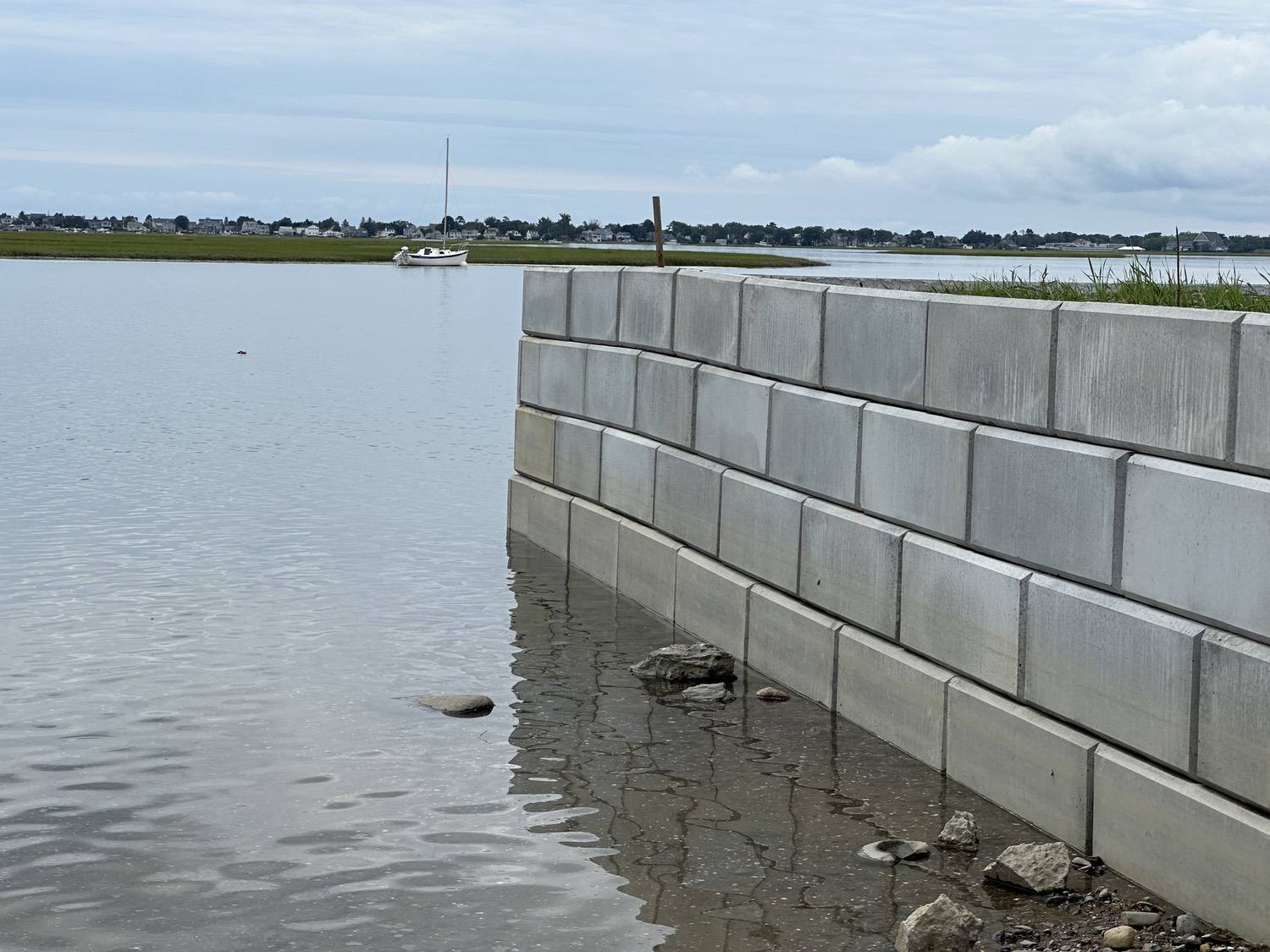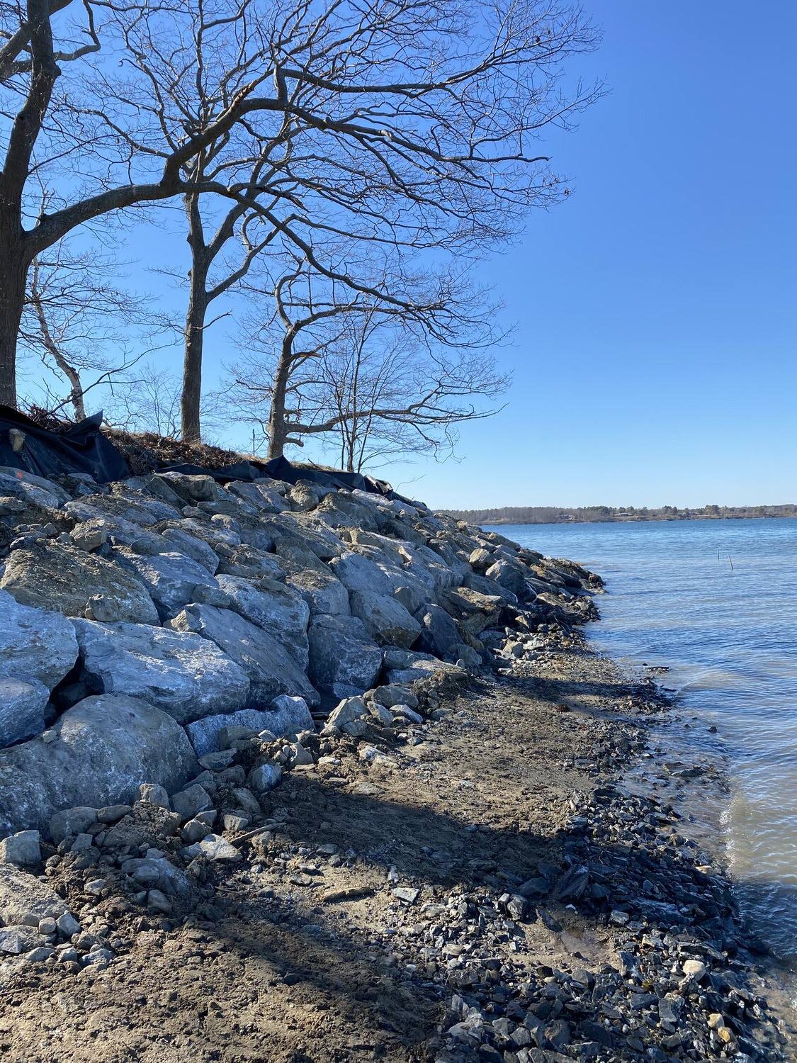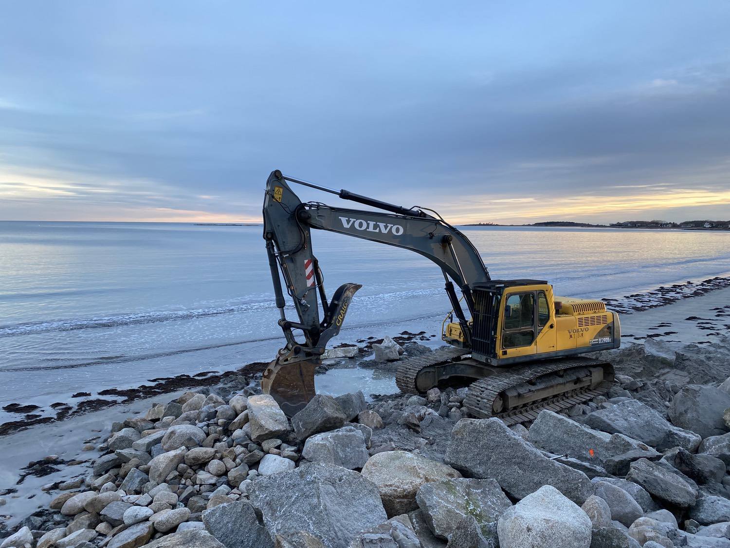 Blasted quarry stones create a jagged structure that dissipates wave energy