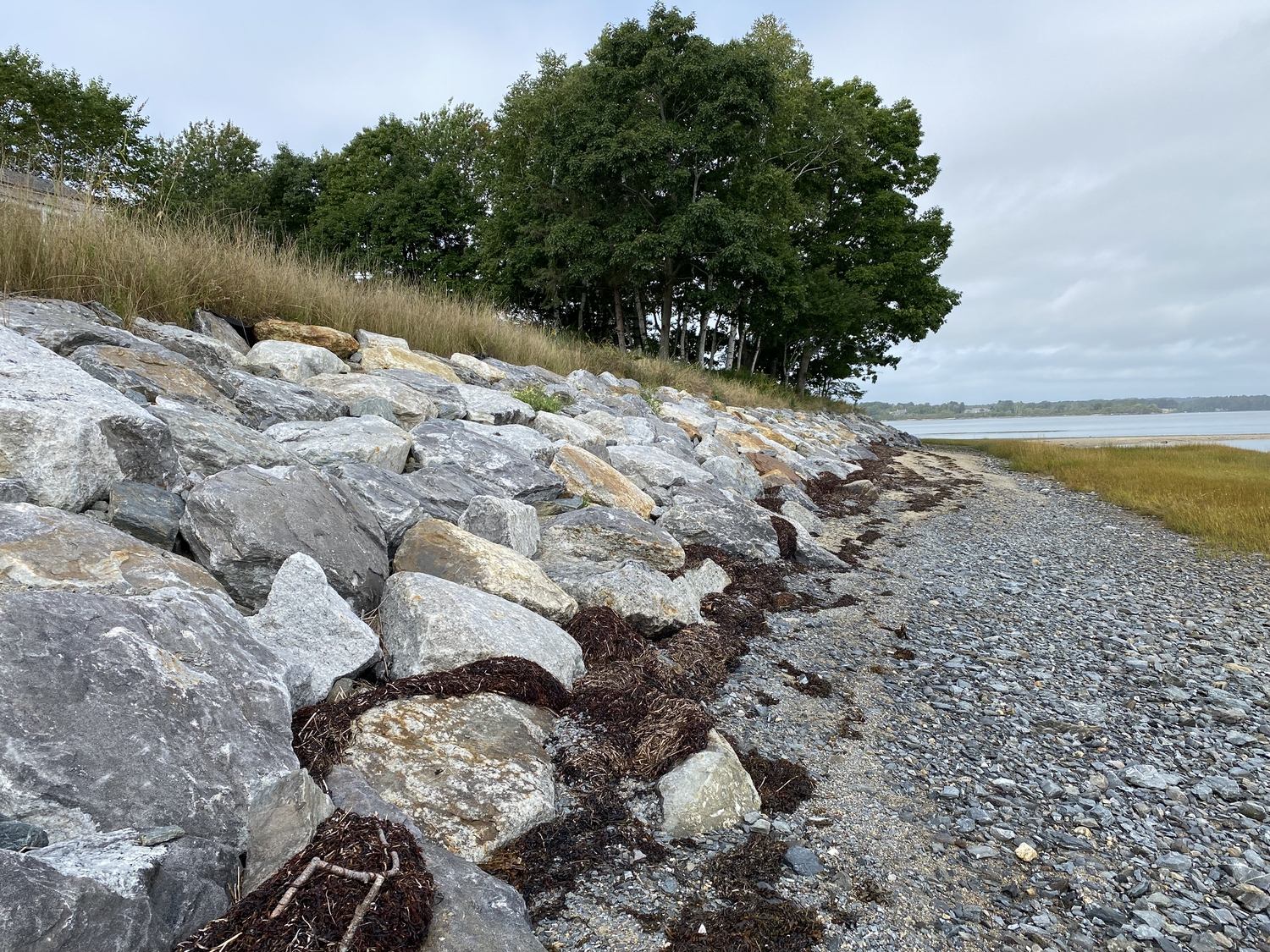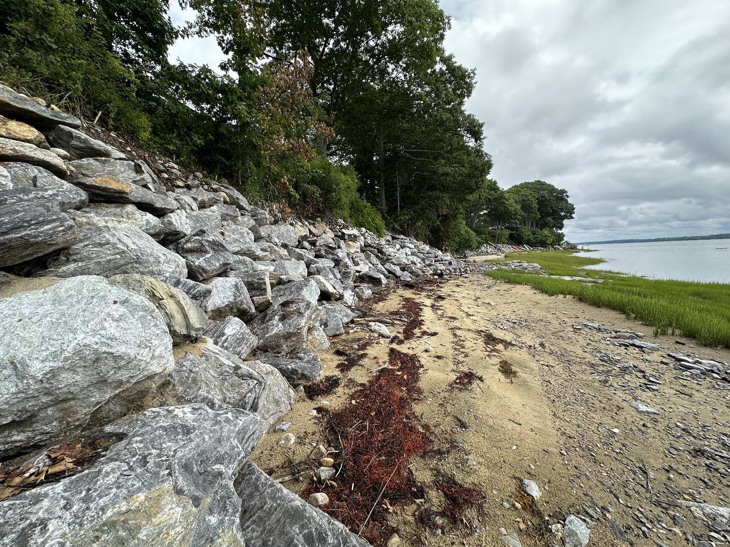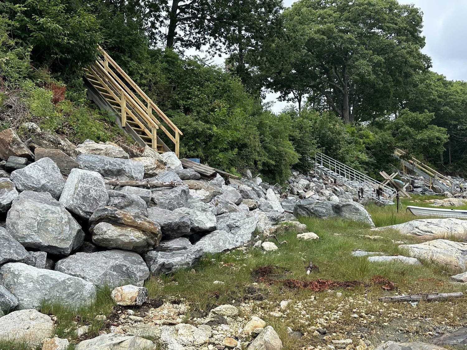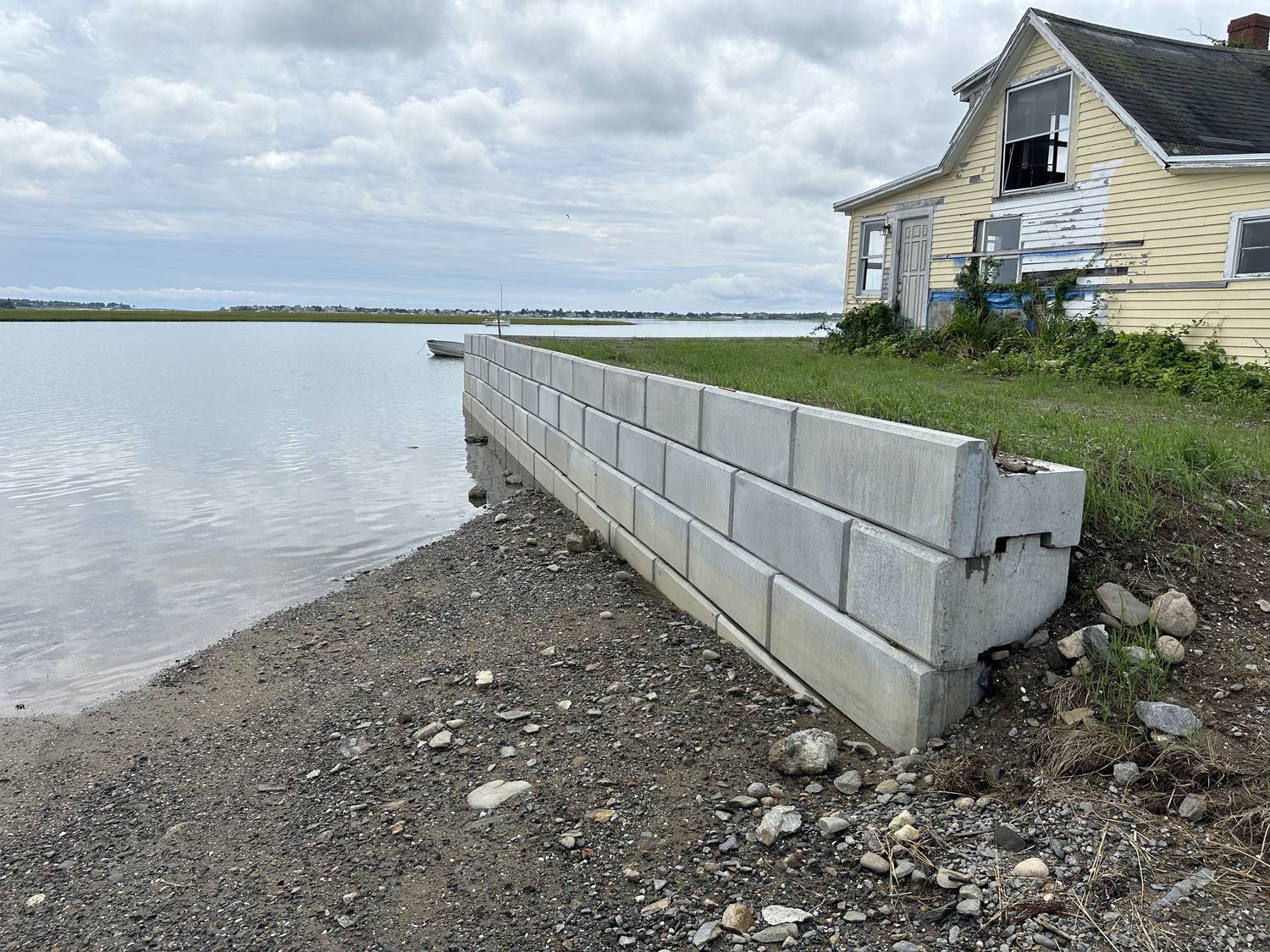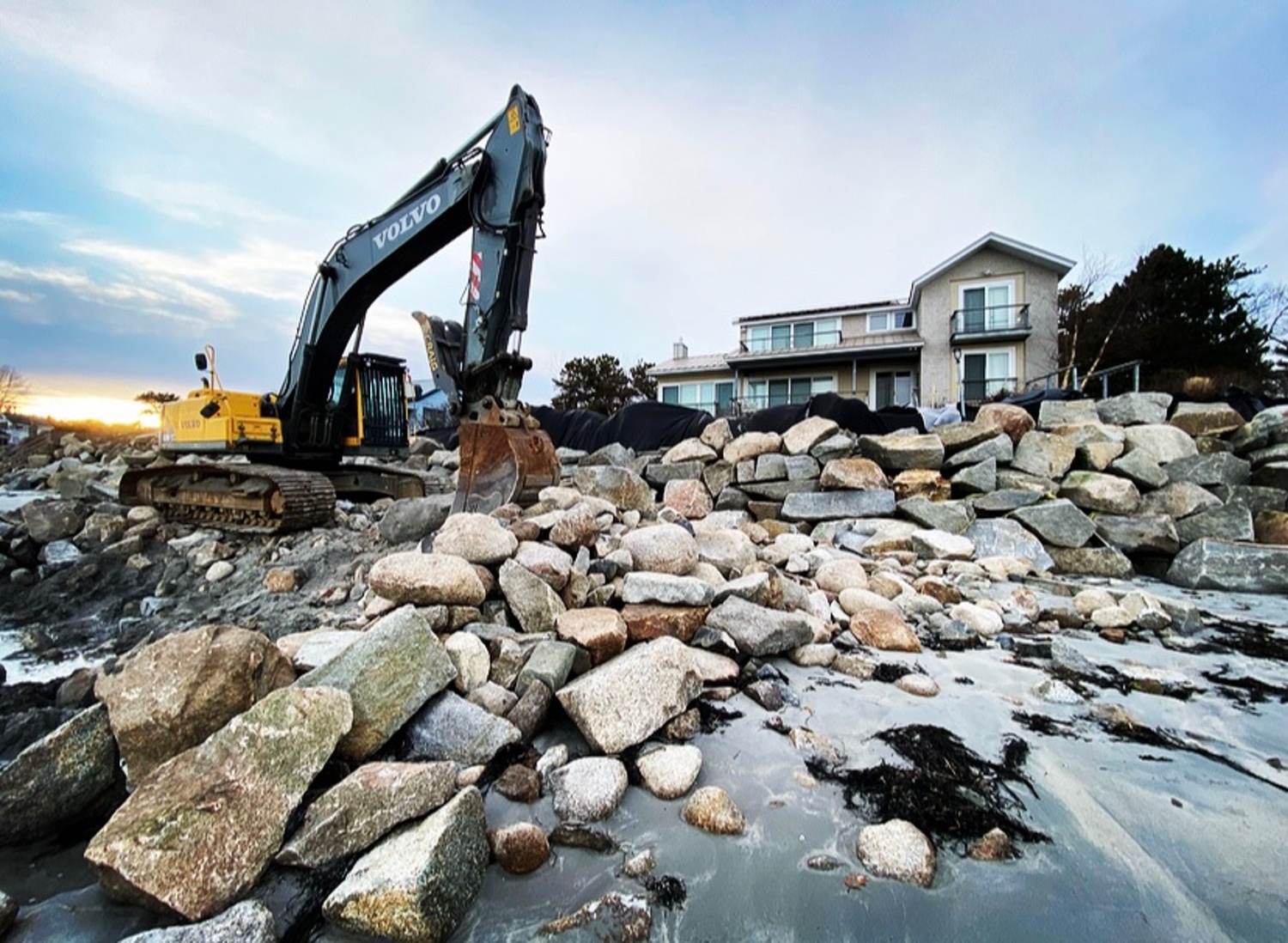Blasted quarry stones create a jagged structure that dissipates wave energy