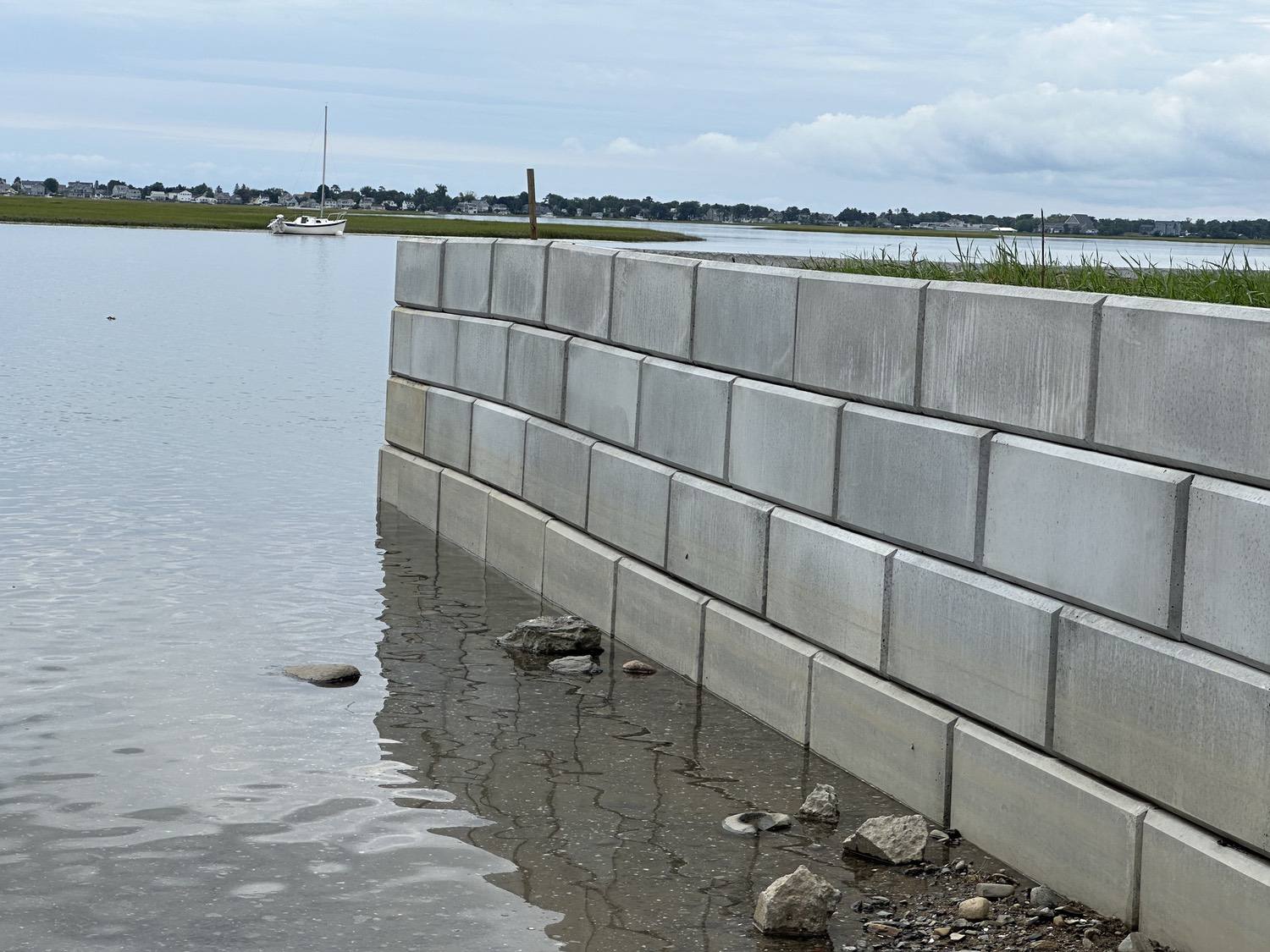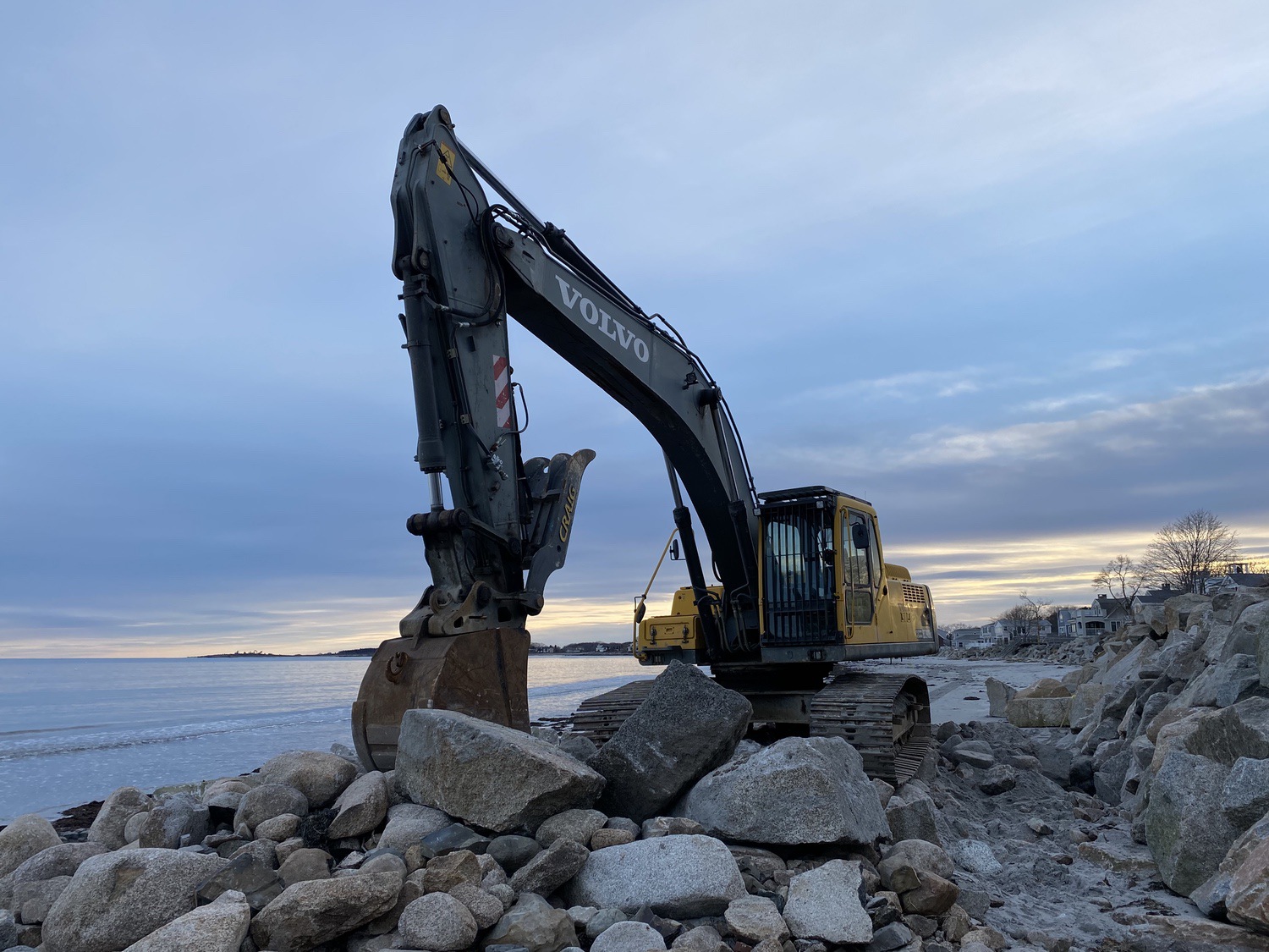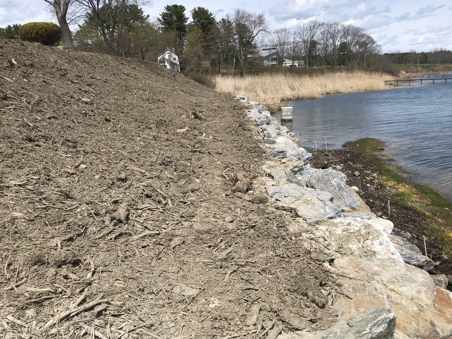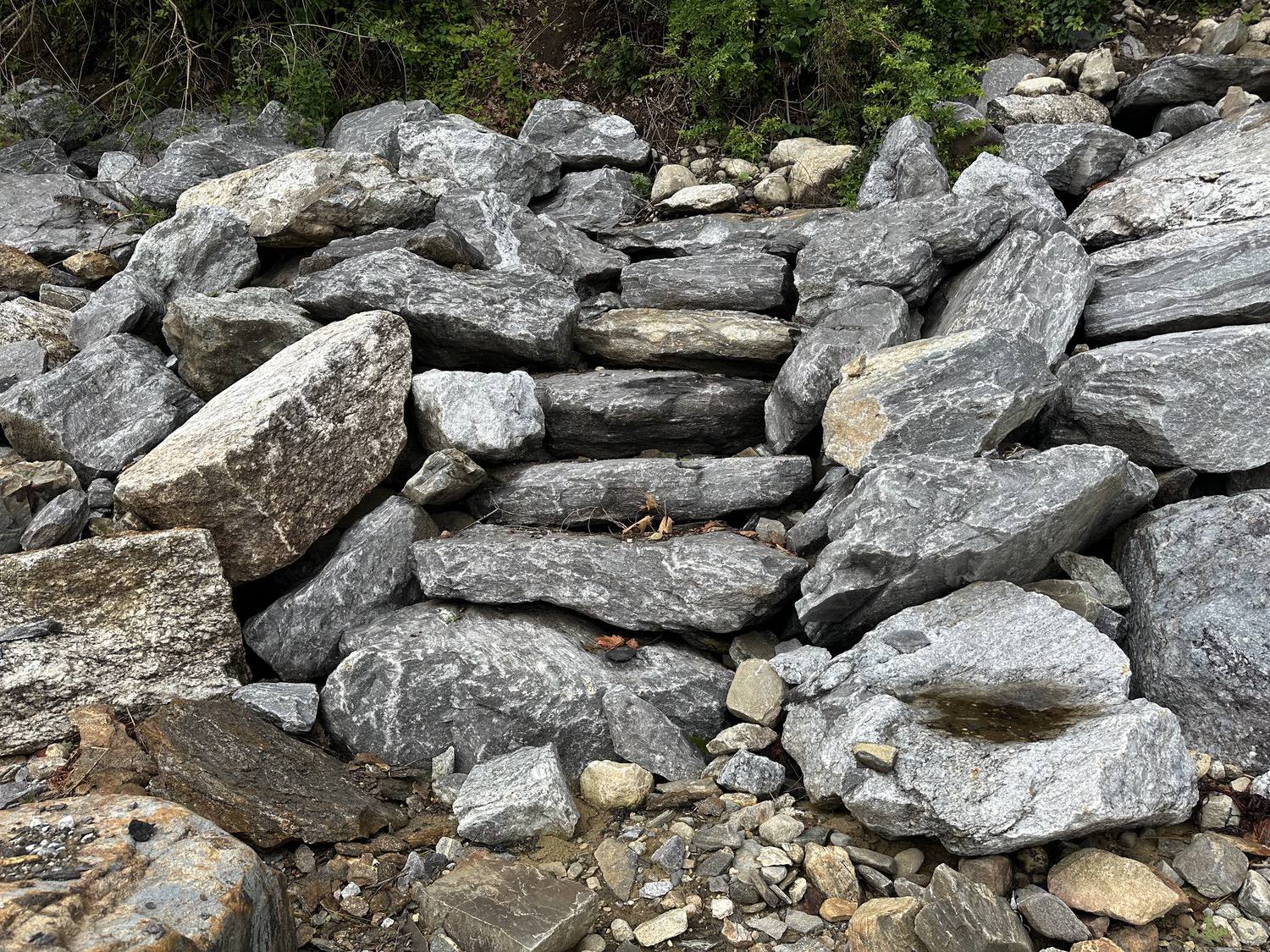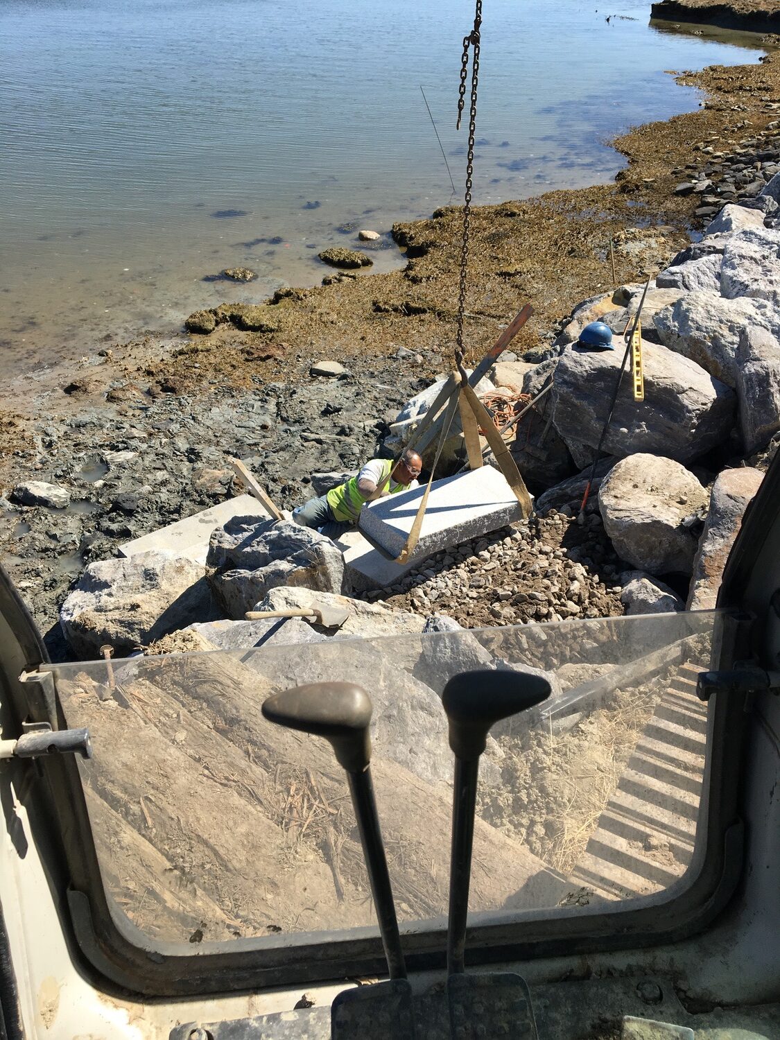 Blasted quarry stones create a jagged structure that dissipates wave energy