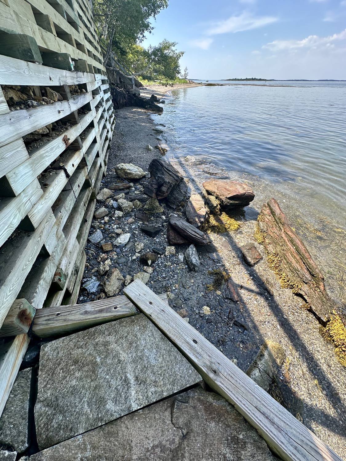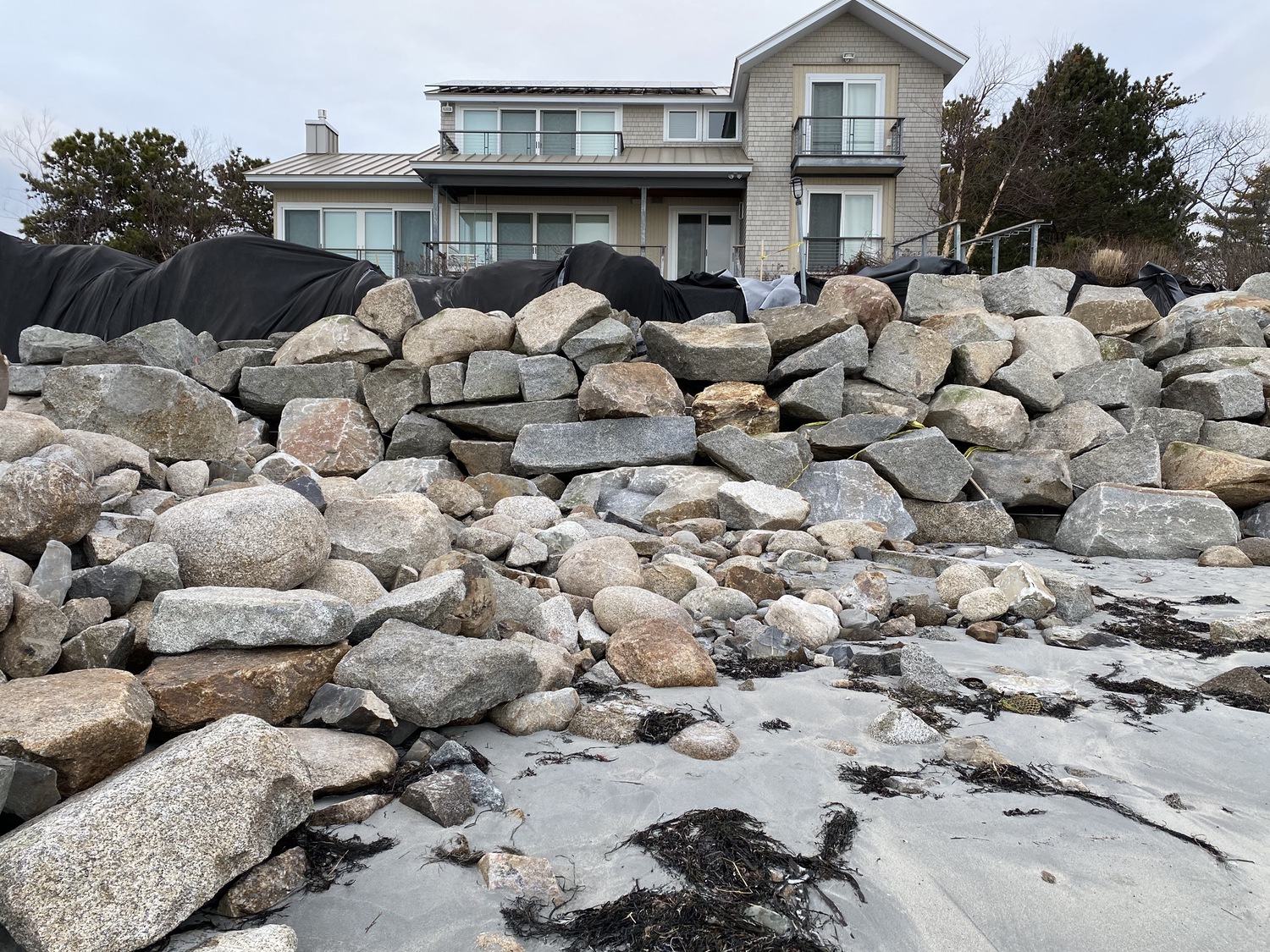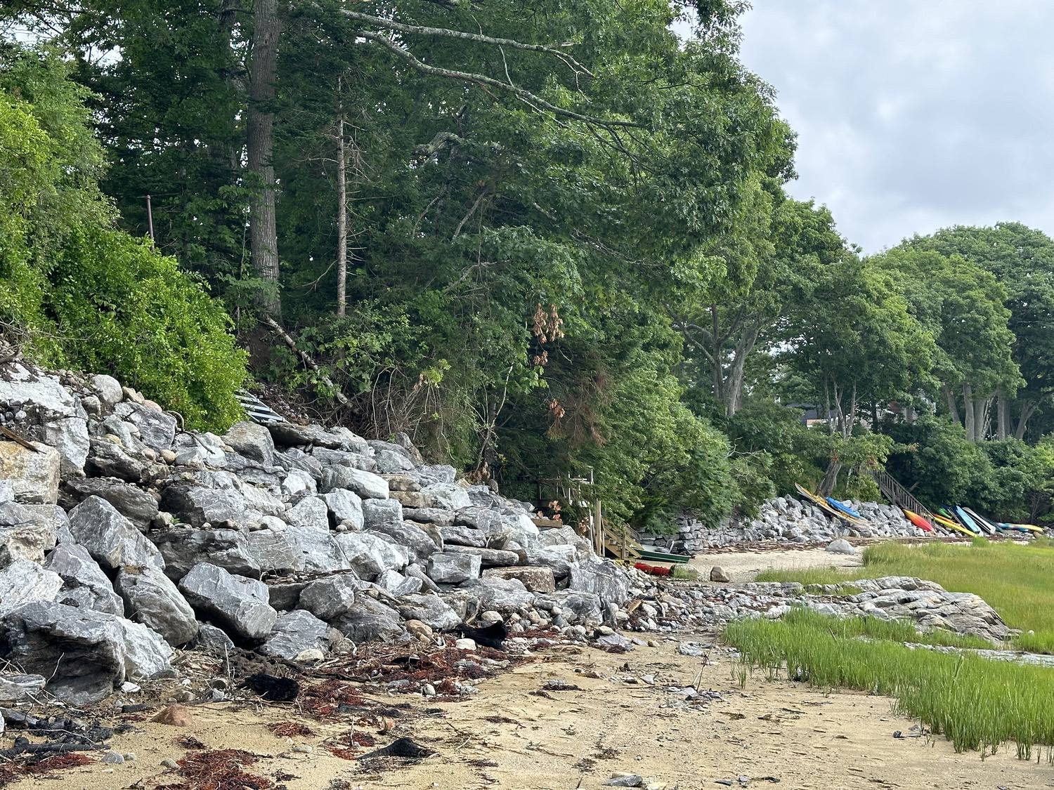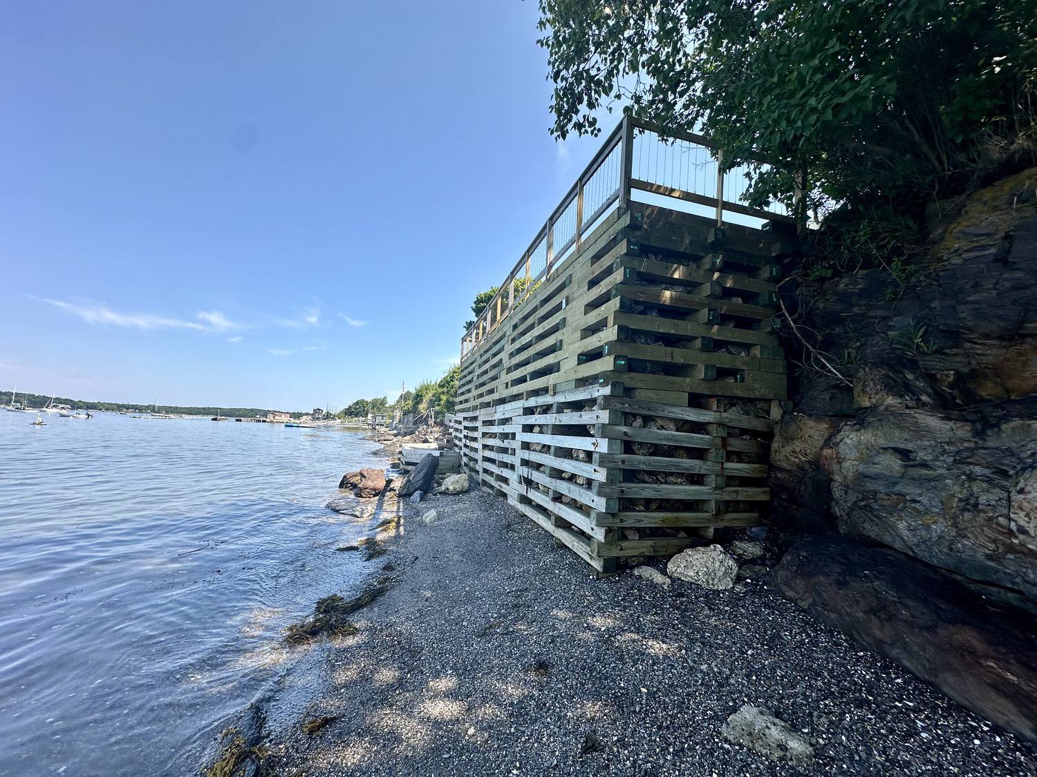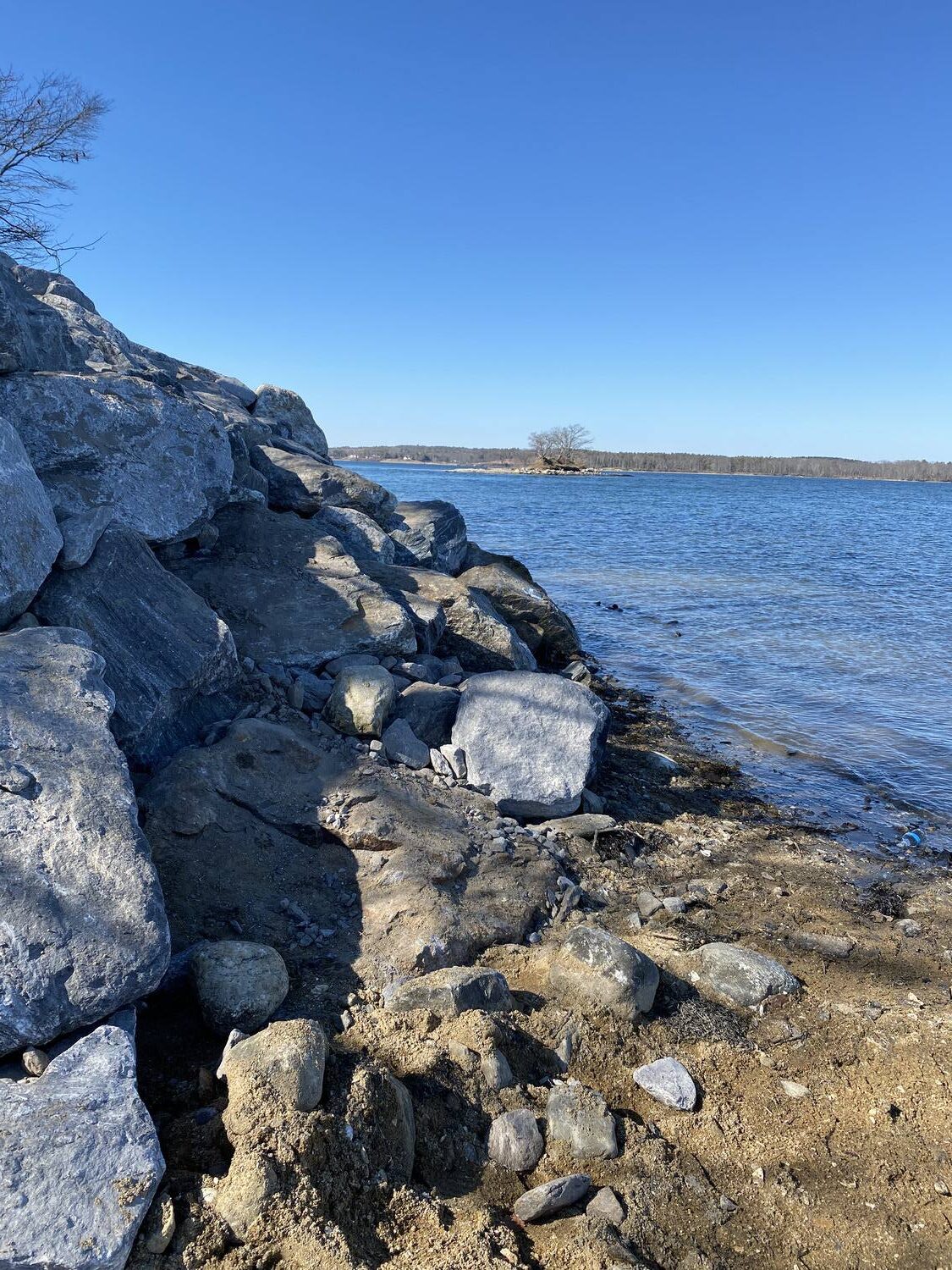 Blasted quarry stones create a jagged structure that dissipates wave energy