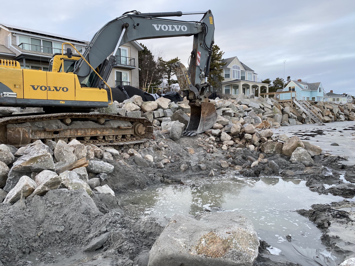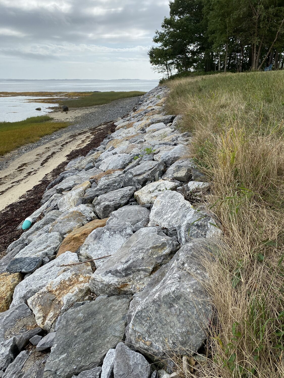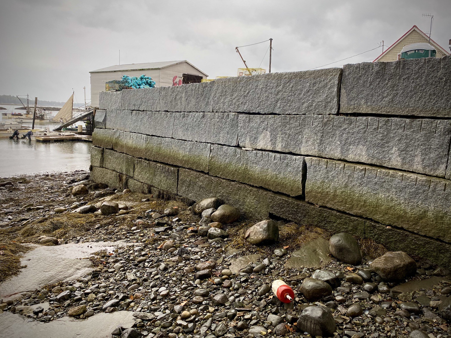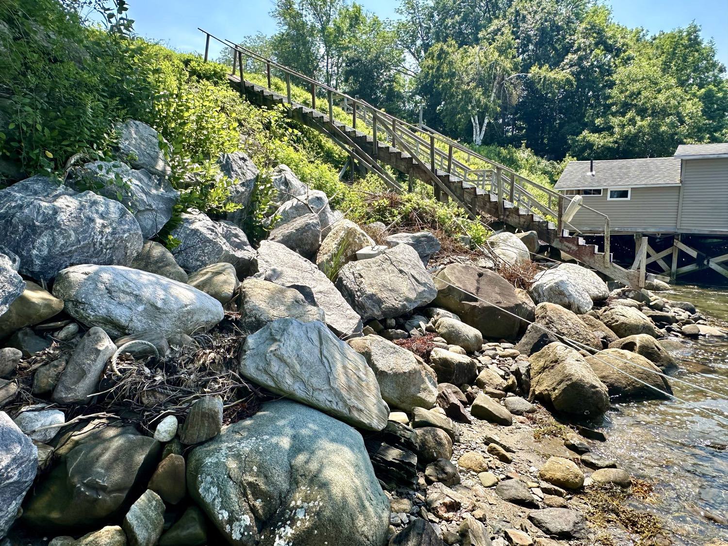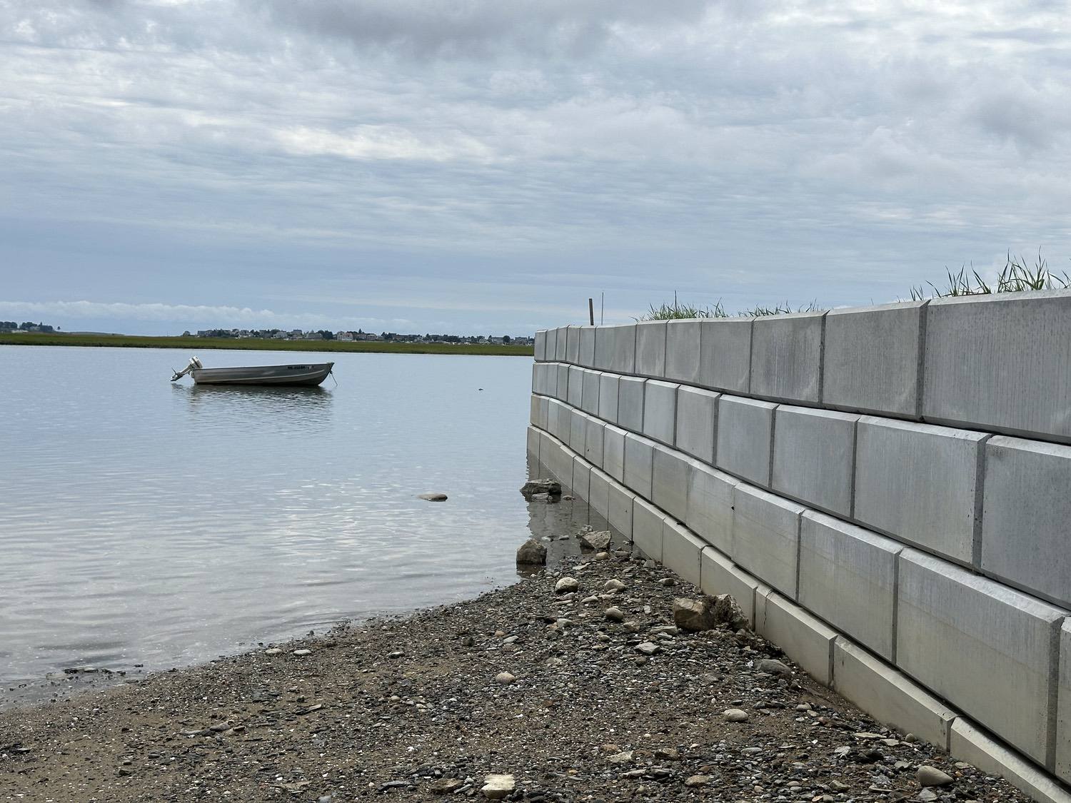 Blasted quarry stones create a jagged structure that dissipates wave energy
