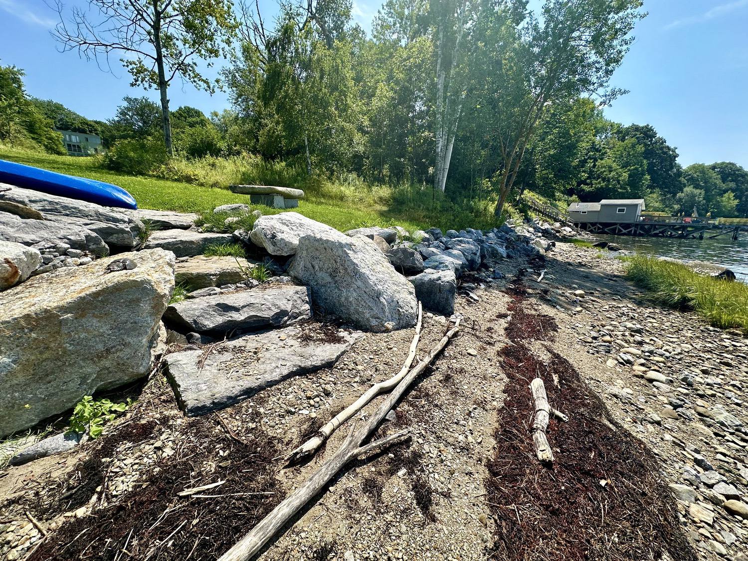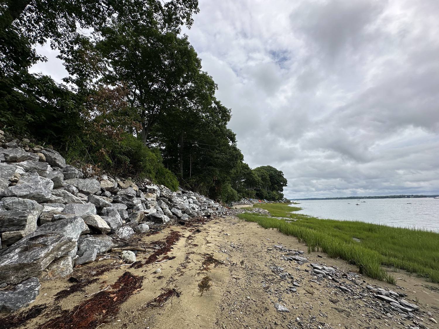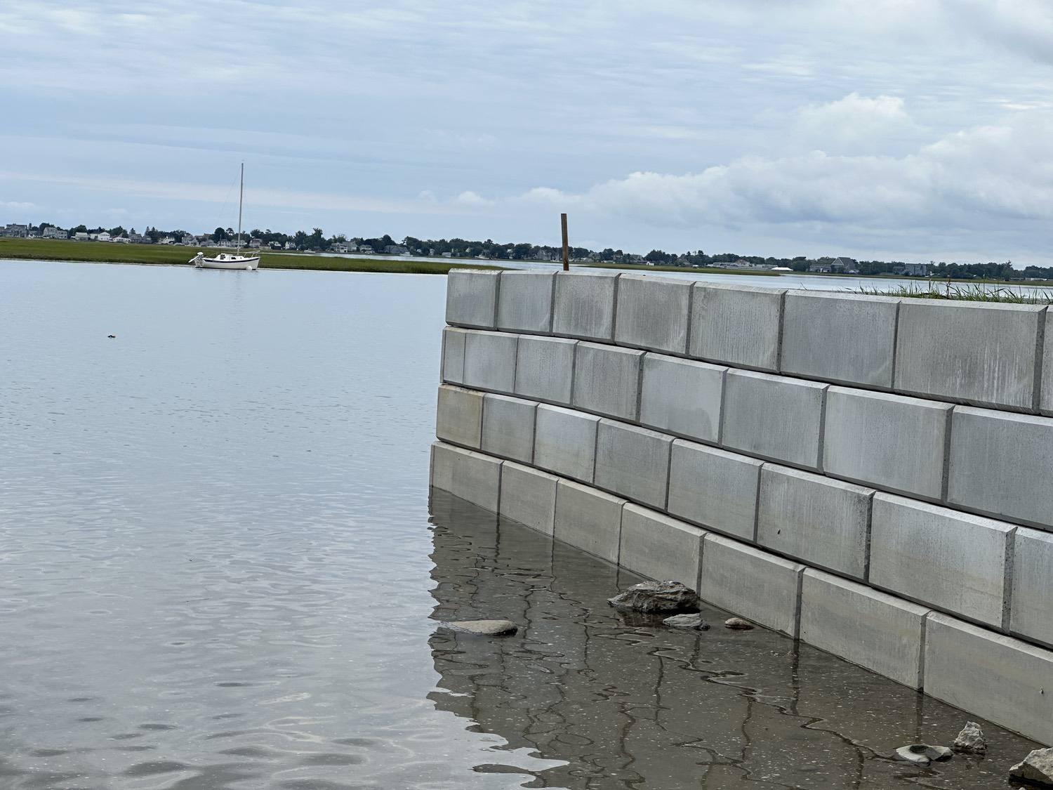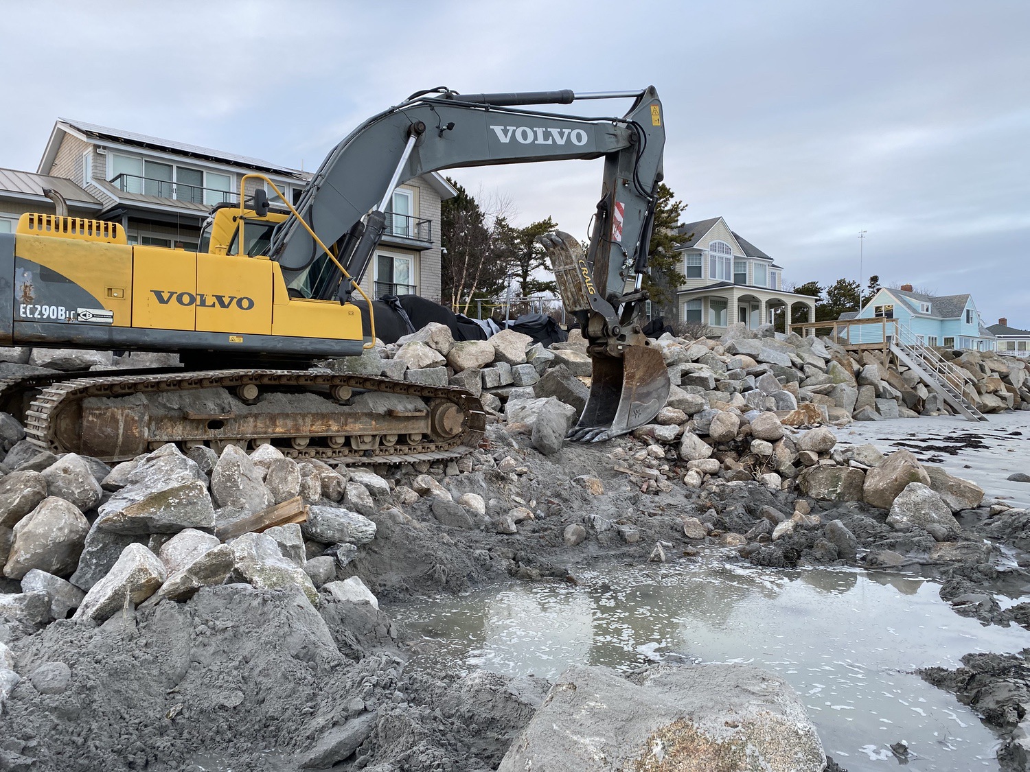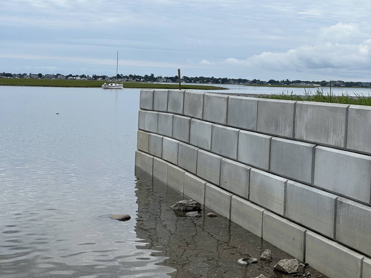 Blasted quarry stones create a jagged structure that dissipates wave energy